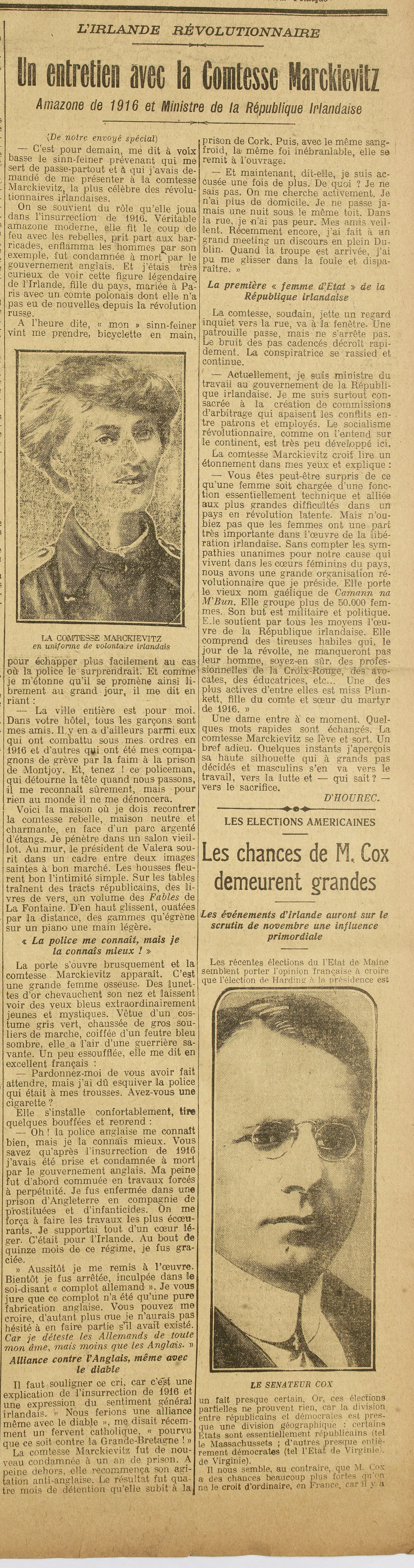 - Un entretien avec la Comtesse Markievitz dans La Liberté